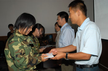 与会的领导向我校2009级的15名贫困学生发放了每人5000元的助学基金。受资助者、食品学院2009级学生盛慧在会上表达了要努力学习、回报社会的决心。