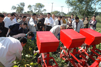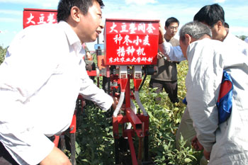 在冬小麦播种现场,工程学院杨悦乾高级工程师向大家介绍了大豆垄间套种冬小麦播种机的结构及使用,大豆垄间套种冬小麦播种机是我校发明的具有三项专利的播种机械,是针对冬小麦播种特点专门研制而成的,保证播种质量。杨悦乾高级工程师还现场为种植户进行播种示范,并回答种植户代表提出的问题,徐梅书记一行实地观看了套种冬小麦的整个过程。