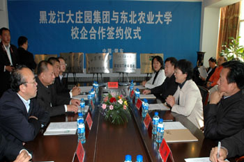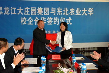 黑龙江省人大常委、大庄园集团董事长陈希滨首先向大家介绍了大庄园集团的发展情况。随后郑秋鹛副校长与陈希滨董事长代表校企双方签署了合作协议。动医学院高利教授、食品学院孔保华教授分别与大庄园集团的下属企业签署了具体科研项目协议。