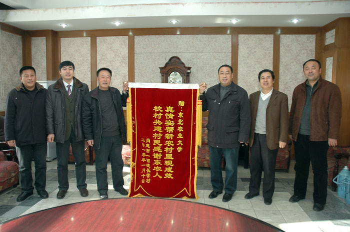 1月29日上午,尚志市一面坡镇长营村党支部书记张秀林、一面坡镇党委书记王立群、尚志市科技副市长姜佰文来到我校赠送锦旗,感谢东北农业大学在新农村帮建工作中给予长营村的大力支持。李庆章校长及学校办公室王洪亮、合作共建与技术转移中心孙占海、唐远征等领导出席并接待。