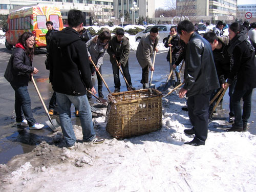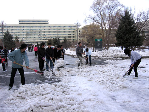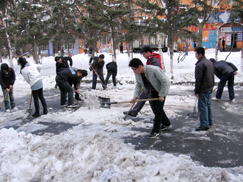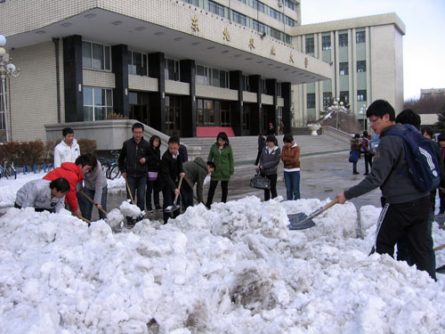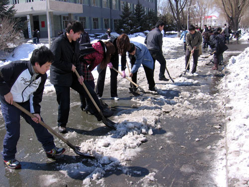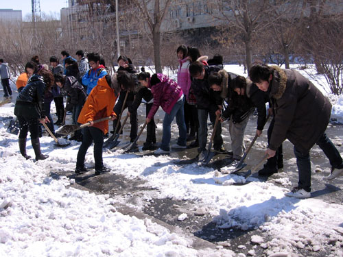 会后,2009级学生辅导员带领学院学生负责本学院分担区,校级各类学生组织和学生义务服务队负责清扫五谷园。经过近一天的不懈努力,各学院克服了雪大冰厚的困难,将所负责分担区清扫完毕,露出干净的路面。此次清雪任务十分艰巨,但参与清雪的师生都毫无怨言,食品学院、园艺学院、农学院、艺术学院、法学院、理学院、动医学院、应用学院、人文学院、动科学院、生命学院、水利学院、资环学院等都及时完成了清雪任务,分担区清扫效果较好。特别是动科、生命、资环、园艺等学院在完成本学院分担区任务的同时还派出志愿者服务队、党员、学生骨干及部分学生组织承担了部分校园公共区的清雪任务。其他一些学院由于工具紧张、地面结冰太厚等原因,截至今天17时,清扫工作还在积极进行当中。