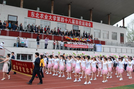 在广播体操比赛中,同学们服装整齐、动作划一、精神饱满,展现了东农学子的精神风貌;在“偷西瓜”、“钻呼拉圈”、“2人3足”、“大拖鞋”等师生趣味项目中,虽然少了径赛场上的激烈角逐,但参赛者都认真准备,积极参与,充分体现了运动会的全员参与性;双截棍、健美操、国标舞、柔力球表演为赛场增添了精彩分呈的看点,他们走到哪,哪就会响起热烈的掌声……各学院拉拉队的欢呼声、呐喊声、掌声和助威声此起彼伏,震耳欲聋,将比赛不断推向高潮。