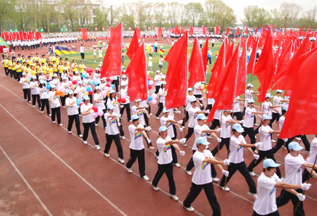 伴随着国旗护卫队方阵整齐威武的步伐,运动会的大幕徐徐拉开,飘扬的彩旗、娇艳的鲜花、各色的宣传板把运动场装点得分外喜庆。本届运动会共有24支代表队参加,各方阵队队员们身着别具特色的服装,喊着嘹亮的口号,激情满怀地走过主席台,接受校领导的检阅。
