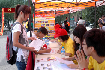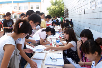 为更好地服务迎新工作,学校组织了志愿者服务队,志愿者以其优质的服务和良好的形象,成为迎新工作的亮点。迎新工作开始之前,学校就在校学生会、学生社团联合会和青年志愿者协会中选拔、培训了100名优秀志愿者;迎新工作期间,学校在火车站、校门口、游泳馆和主楼前设立了四个迎新生志愿服务站,并组织了12支志愿者服务队,统一穿着印有志愿者标志的服装,在校内的重点路段进行流动执勤,为新生及家长提供咨询和引导服务。各学院团委、学生会和社团也组织志愿者在迎新场地协助本学院的新生办理报到手续。迎新期间,全校共组织3000余人次的志愿服务。志愿者热情细致的工作风格,严谨认真的工作态度给新生及家长留下了深刻的印象,同时也有效地配合了学校迎新工作的圆满完成。