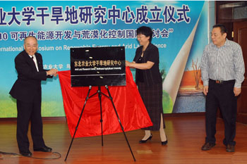 我校党委书记徐梅与日本鸟取大学理事•副校长岩崎正美、中国农业工程学会秘书长秦京光一同为我校干旱地研究中心揭牌。