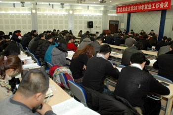 最后,校党委书记徐梅,就进一步做好我校2011年毕业生就业工作,提出三点意见。一是统一思想、提高认识,不断增强做好就业工作的责任感和紧迫感。2009年,党中央、国务院提出“把高校毕业生就业摆在当前就业工作的首位”的重要决策,充分体现了做好高校毕业生就业工作所具有的战略性和全局性意义。对此我们一定要认真学习,准确把握,深刻领会。要从讲政治的高度,从解决民生的角度,从促进发展的立场,充分认识做好大学生就业工作的重要意义。二是转变观念、深化改革,不断拓展毕业生就业的载体和渠道。 要想做好毕业生就业工作,必须牢固树立“以人为本,学生至上,为学生服务,对学生负责”的就业工作理念,充分认识当前形势,转变思想观念,深化机制改革,开拓就业市场,不断拓展毕业生就业的载体和渠道。要积极转变就业工作观念,从精英式教育、执业的思维定势中解放出来;要深入推进招生制度改革,不断调整优化专业结构;要积极开拓就业市场,拓宽毕业生就业渠道。三是健全机制、强化措施,不断提高毕业生就业工作质量和水平。今后较长一段时间,就业工作仍将是一项牵动学校全局的工作,也是一项非常艰巨的任务。2011年,我校毕业生就业工作仍然任务艰巨、责任重大,学校上下必须要统一思想,明确目标,细化责任,统筹协调,共同做好毕业生就业工作。要进一步加强组织领导,将就业工作纳入重要议事日程;要进一步建立健全工作目标责任制,形成“任务分解、责任明确、分工合作、奖惩挂钩”的就业工作管理机制;要进一步加强就业指导和服务体系建设,不断提升就业工作水平。最后,徐梅书记希望大家能继续坚持以发展的眼光看待就业工作,抱着对学校和学生高度负责的态度,以饱满的热情扎实推进毕业生就业工作。努力实现2011年的就业工作目标,使学校得就业工作再迈上一个崭新的台阶。