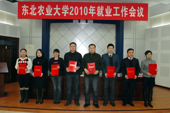 校长李庆章宣读了《东北农业大学关于表彰2010年毕业生就业工作先进单位及先进个人的决定》;应用技术学院和水利与建筑学院获得校就业工作先进集体一等奖,资源与环境学院、生命科学学院、动物医学学院、工程学院、农学院获得校就业工作先进集体二等奖,经济管理学院获得校就业工作先进集体鼓励奖;于向国、张华英、刘春鹏、孙涛、汪文斌、孟祥伟、宫建伟、钱芳、汪志君、高志刚10位同志获得校就业工作先进个人。与会校领导为获奖集体和个人颁发了荣誉证书。