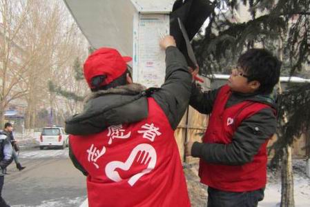 志愿者清理校园内的小广告