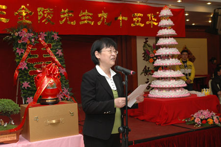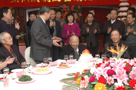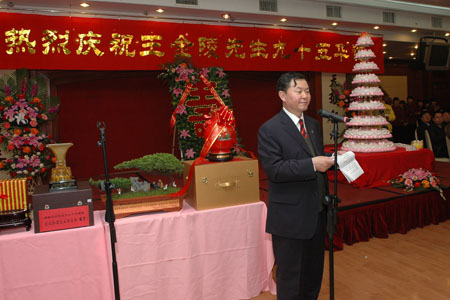 与会领导、嘉宾及王金陵先生的亲属、朋友、弟子等共同举杯欢庆王金陵先生九十五华诞,一声声真挚的话语,一句句诚挚的祝愿,道出了先生辉煌的业绩和崇高的品格,整个宴会大厅溢满祝福之情。