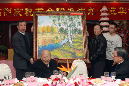 黑龙江省教育厅厅长张永洲向王金陵先生赠送生日贺礼