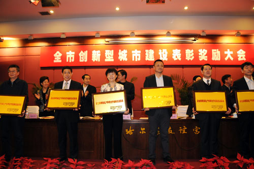3月29日上午,在哈尔滨友谊宫召开的全市创新型城市建设表彰奖励大会上,我校被哈尔滨市委、市政府授予“在哈科研单位产学研合作创新先进集体” 荣誉称号。我校党委书记、校长徐梅代表学校出席会议并接受市领导颁奖。