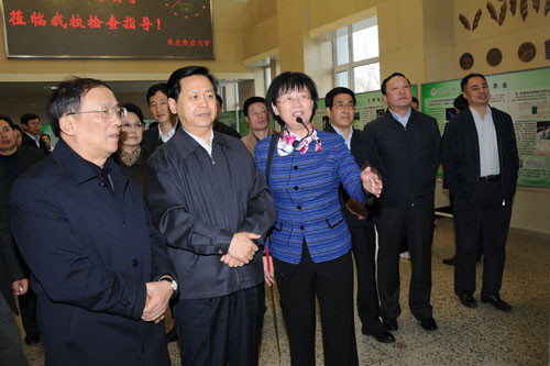 在农学楼,徐梅为王宪魁省长等详细介绍了我校生物产业支撑技术研发情况,内容涉及生物制药、生物能源与生物环保、生物农业等相关项目的产品研究深度、市场占有情况及市场前景等。