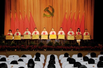 7月1日上午,我校庆祝中国共产党成立90周年大会暨表彰大会在音乐厅召开。校党委书记、校长徐梅以及全体在校校领导,全校正、副处级党员领导干部,受到党委表彰的先进基层党组织和先进个人,各单位党员代表参加了会议。大会表彰了在我校“创先争优”活动中涌现出来的先进基层党组织、优秀共产党员、优秀党务工作者,以及各单位创建的教学、科研、管理服务、老有所为和成才表率党员先锋岗。