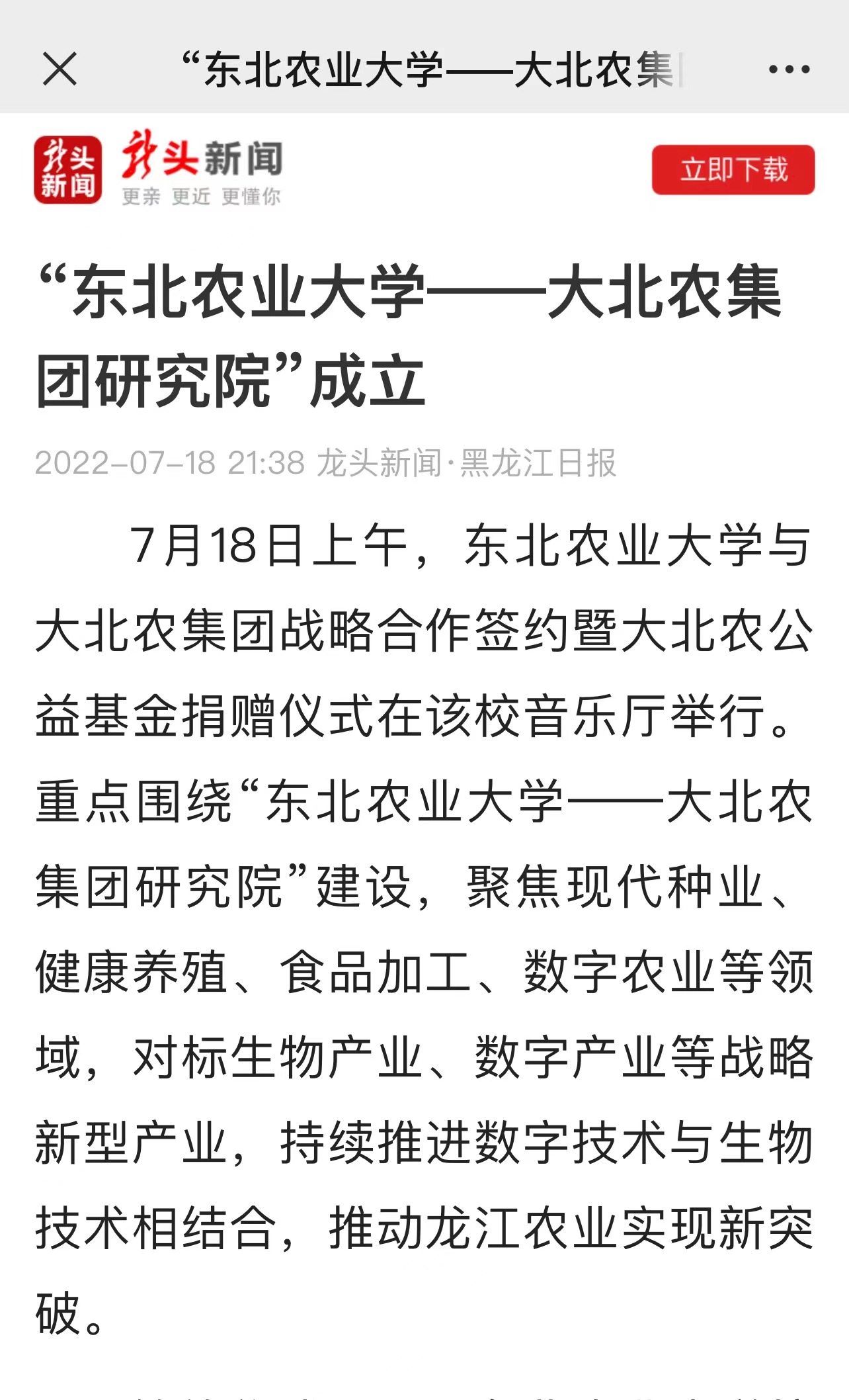 7月18日上午,东北农业大学与大北农集团战略合作签约暨大北农公益基金捐赠仪式在该校音乐厅举行。重点围绕“东北农业大学——大北农集团研究院”建设,聚焦现代种业、健康养殖、食品加工、数字农业等领域,对标生物产业、数字产业等战略新型产业,持续推进数字技术与生物技术相结合,推动龙江农业实现新突破。