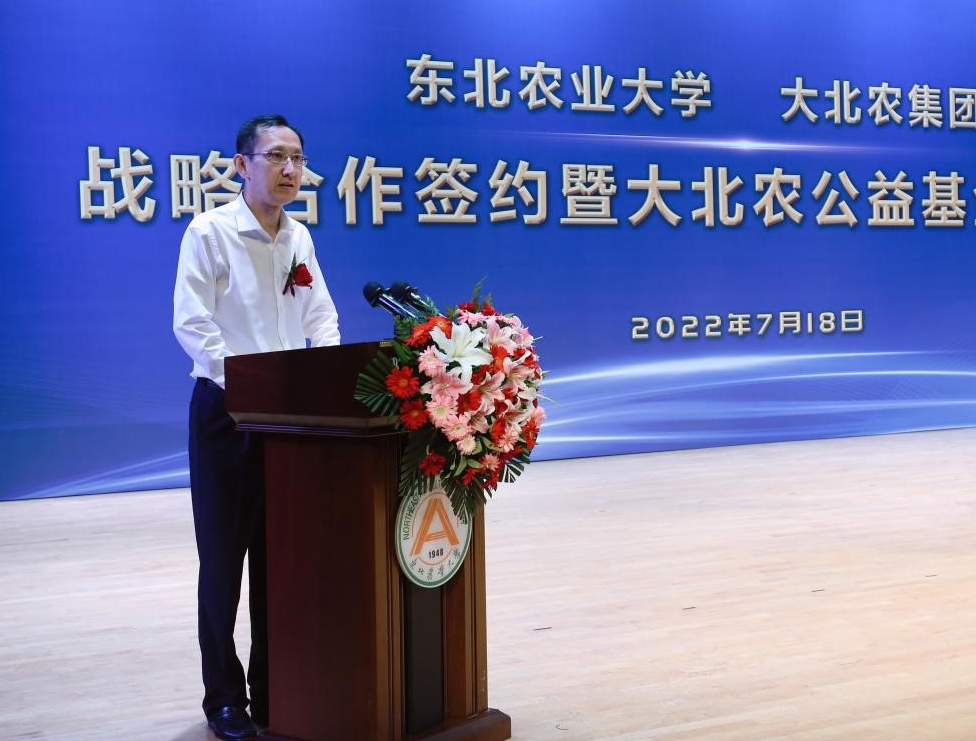 李长生致辞表示,本次战略合作协议的签订,是东北农业大学和大北农集团深化校企合作、助力龙江经济发展的使命担当,更是促进双方发展、实现互利共赢的生动实践。东北农业大学将充分用好大北农公益基金捐赠,重点围绕“东北农业大学—大北农集团研究院”建设,聚焦现代种业、健康养殖、食品加工、数字农业等领域,对标生物产业、数字产业等战略新兴产业,持续推进数字技术与生物技术相结合,在科技创新、平台建设、成果转化、人才培养和乡村振兴等方面开展全面务实合作。