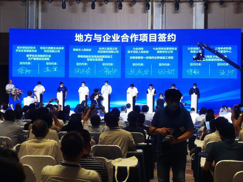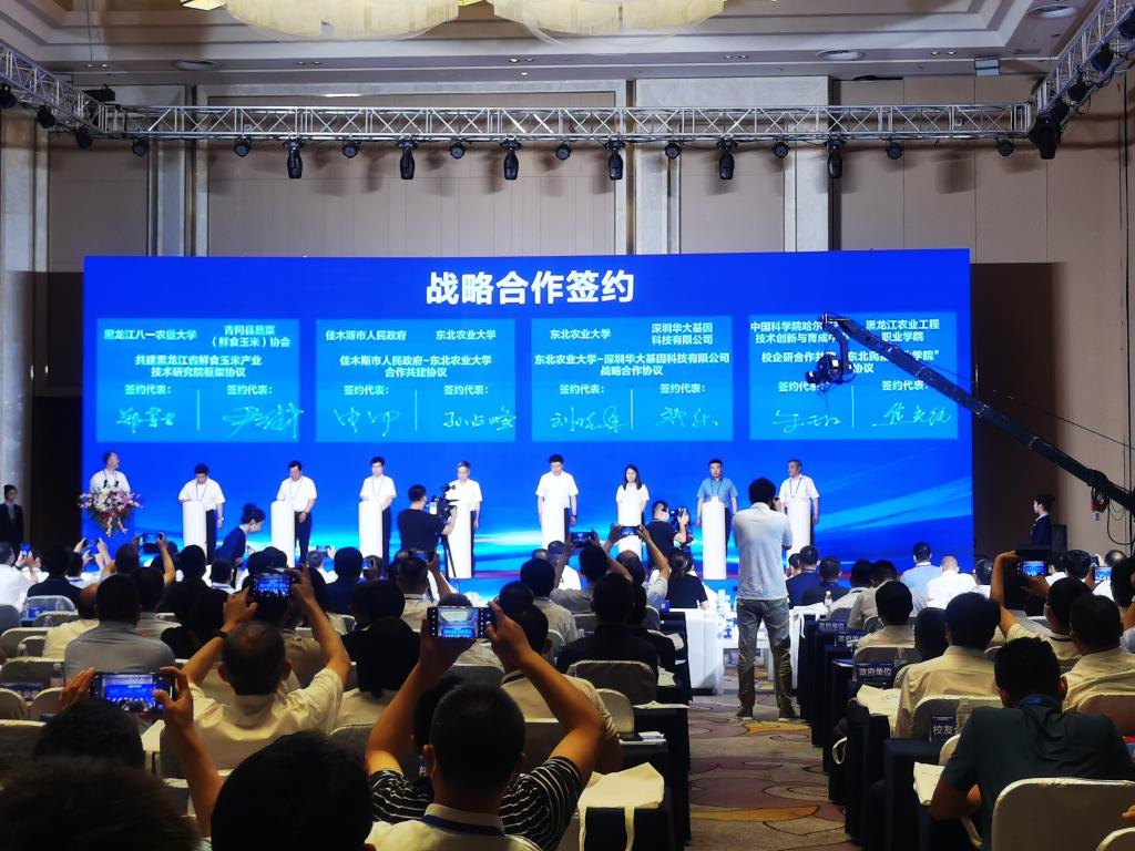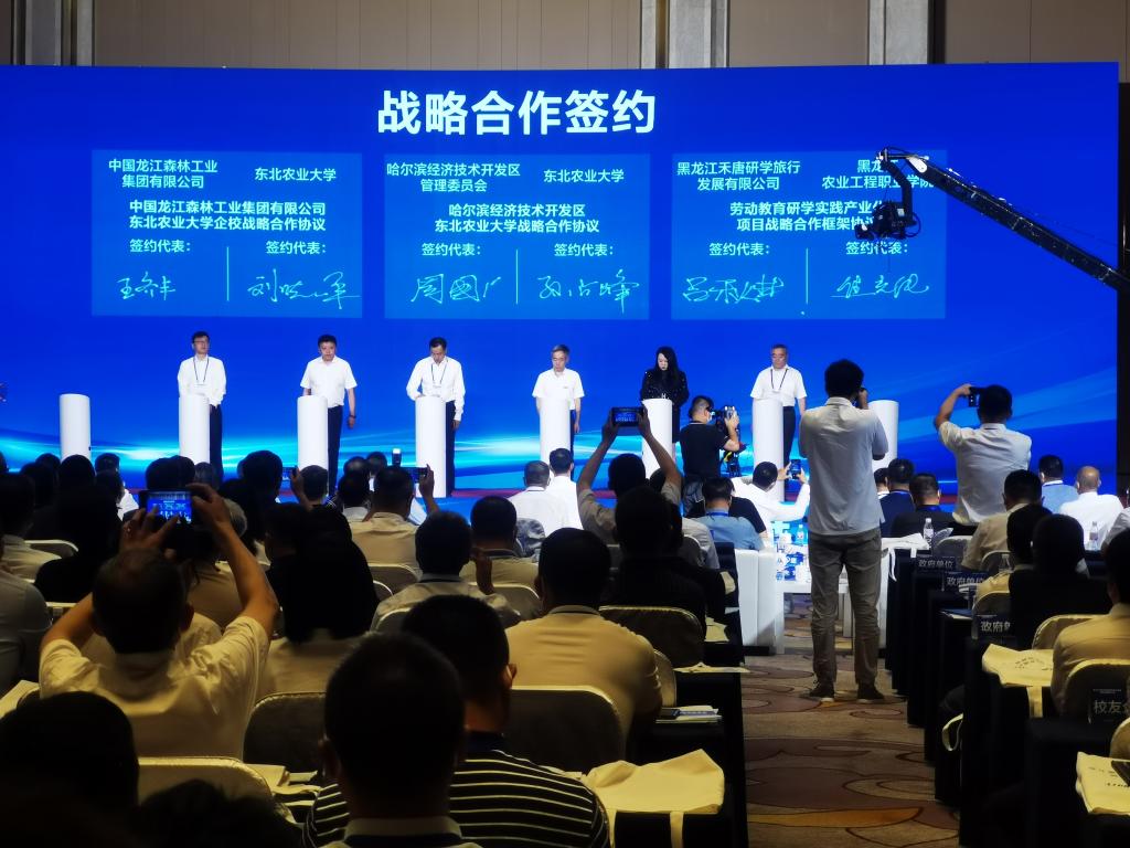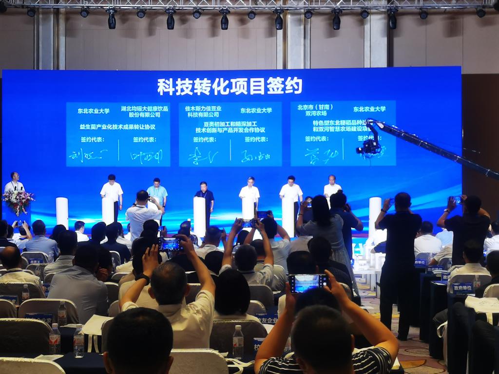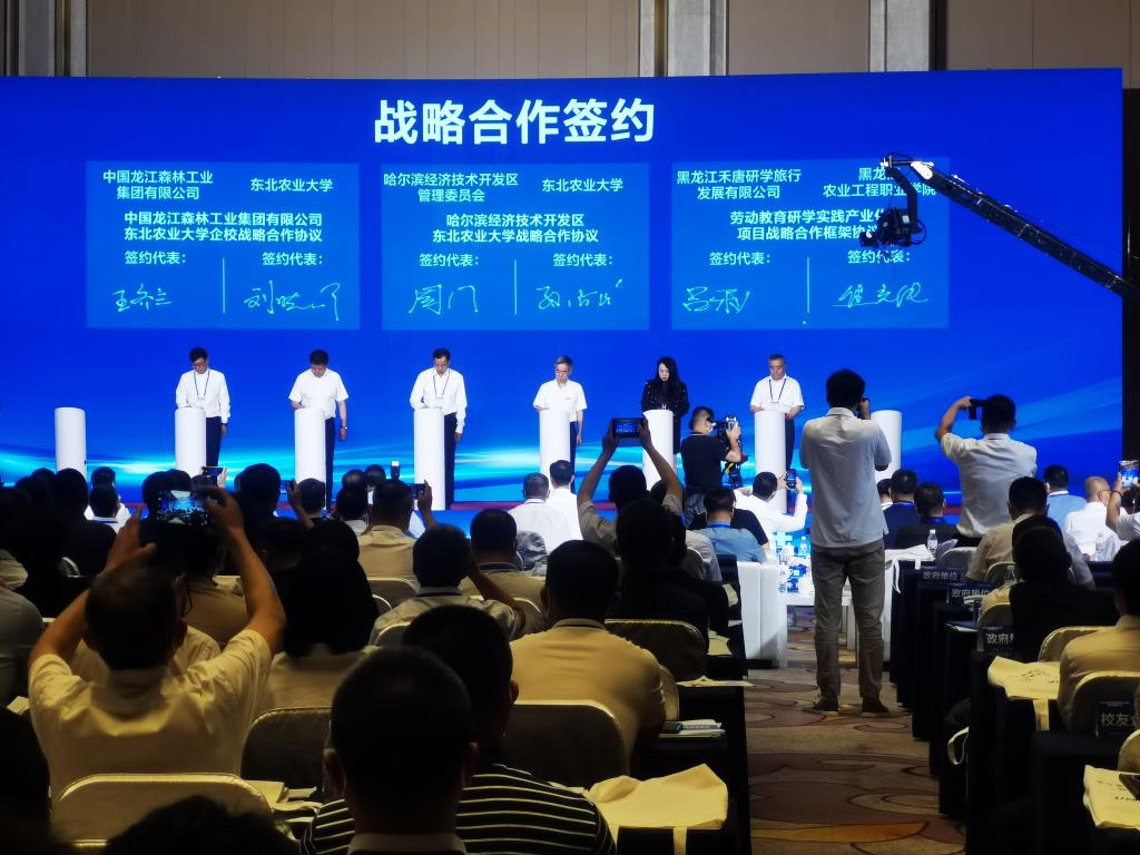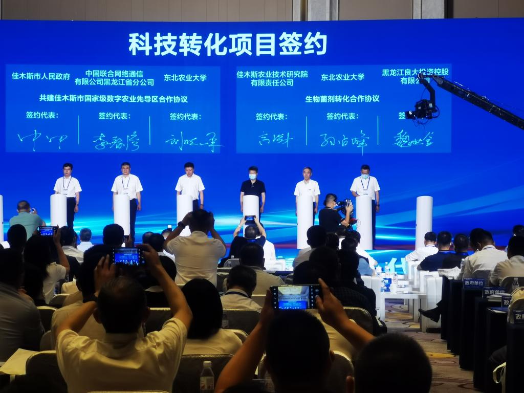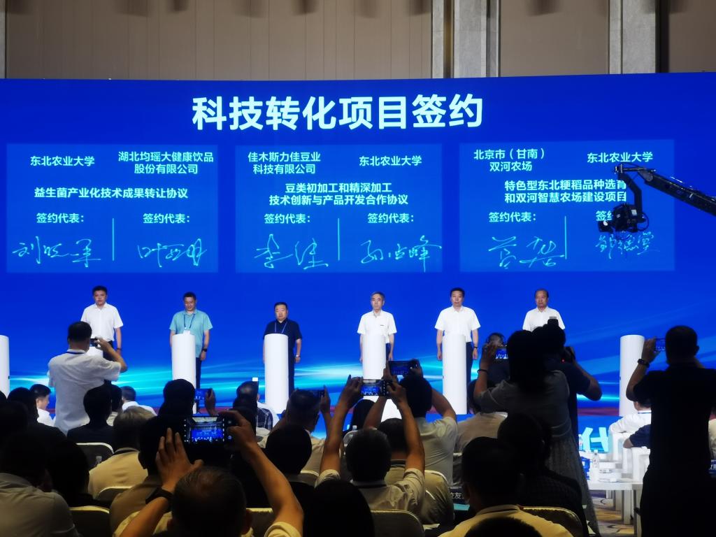 佳木斯市人民政府-东北农业大学合作共建、东北农业大学-深圳华大基因科技有限公司战略合作、哈尔滨经济技术开发区-东北农业大学战略合作、中国龙江森林工业集团有限公司-东北农业大学企校战略合作、豆类初加工和精深加工技术创新与产品开发合作、特色型东北粳稻品种选育和双河智慧农场建设项目、益生菌产业化技术成果转让、共建佳木斯市国家级数字农业先导区合作、生物菌剂转化合作等9个项目进行现场签约。