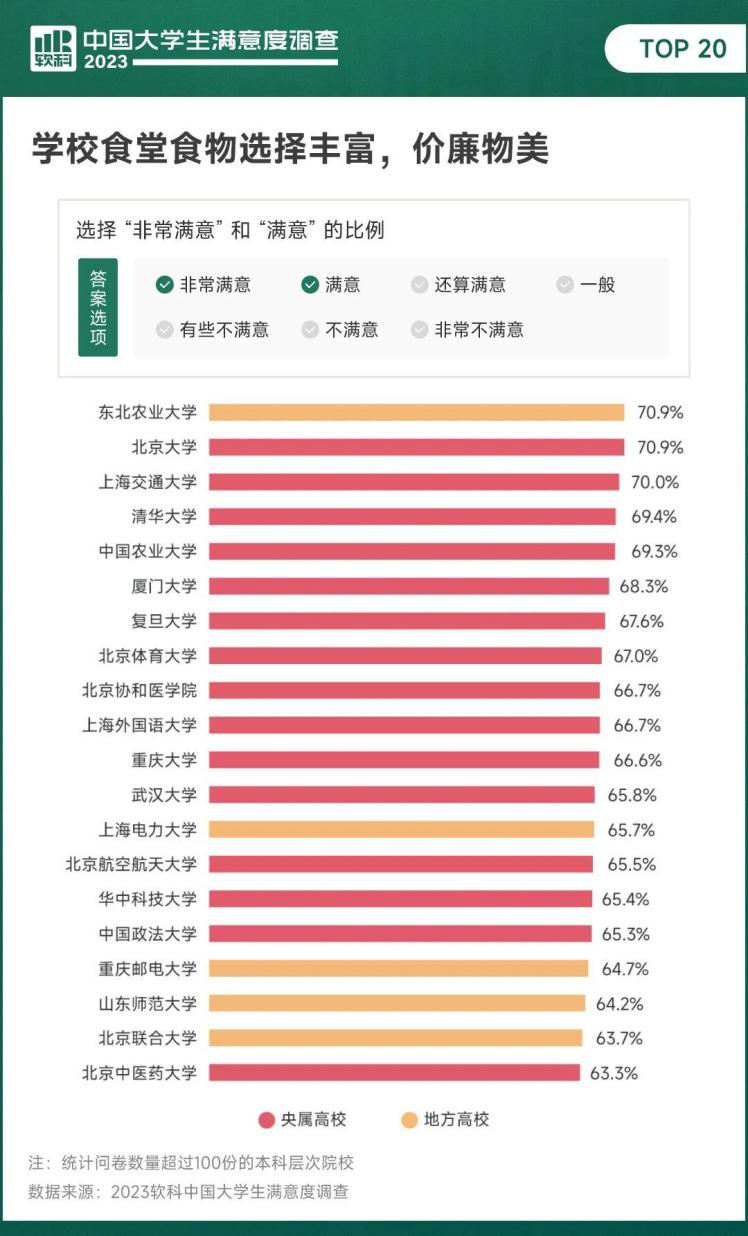 近日,高等教育专业评价机构软科发布《2023中国大学生满意度调查结果》,在“学校食堂食物选择丰富,物美价廉方面”,东北农业大学有70.9%的学生对其感到满意或非常满意,与北京大学并列榜首。