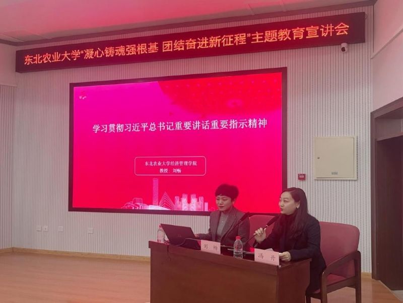 为全面贯彻落实习近平新时代中国特色社会主义思想,推进东北农业大学各民主党派、无党派人士和党外知识分子持续深入开展“凝心铸魂强根基、团结奋进新征程”主题教育,11月21日,东北农业大学在图书馆229报告厅举办“凝心铸魂强根基、团结奋进新征程——学习贯彻习近平总书记视察黑龙江重要讲话重要指示精神主题宣讲会”。宣讲会邀请中共黑龙江省委讲师团讲师、黑龙江省高端智库—现代农业发展研究中心智库专家、东北农业大学继续教育学院院长、经济管理学院教授、刘畅做主题宣讲。学校民主党派成员、无党派人士、归国留学人员、党外知识分子参加此次宣讲报告会。会议由东北农业大学统战部副部长冯丹主持。