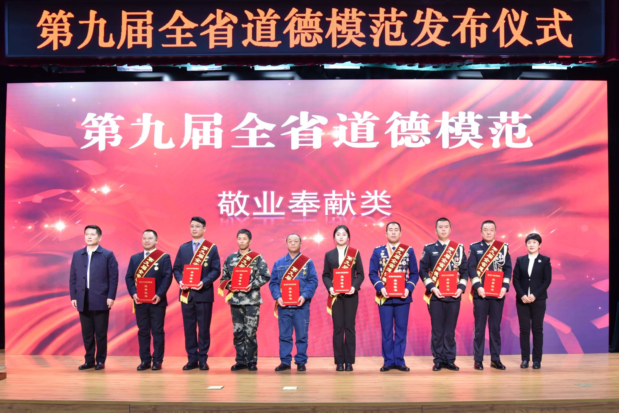发布仪式现场,播放了第九届全省道德模范评选活动宣传短片,6位宣讲人声情并茂地讲述了道德模范感人至深的温情故事。他们当中有放弃出国深造机会回到母校,立志把大豆变金豆的博士;有收入微薄却拾金不昧的环卫工人;有在极寒天气连续巡线十余小时的国家电网最北“守门人”;也有勇救落水青年不留姓名的特战队员。他们助人为乐,见义勇为,诚实守信,敬业奉献,孝老爱亲,用自己的行动鲜明标注了时代价值取向和社会道德高度。