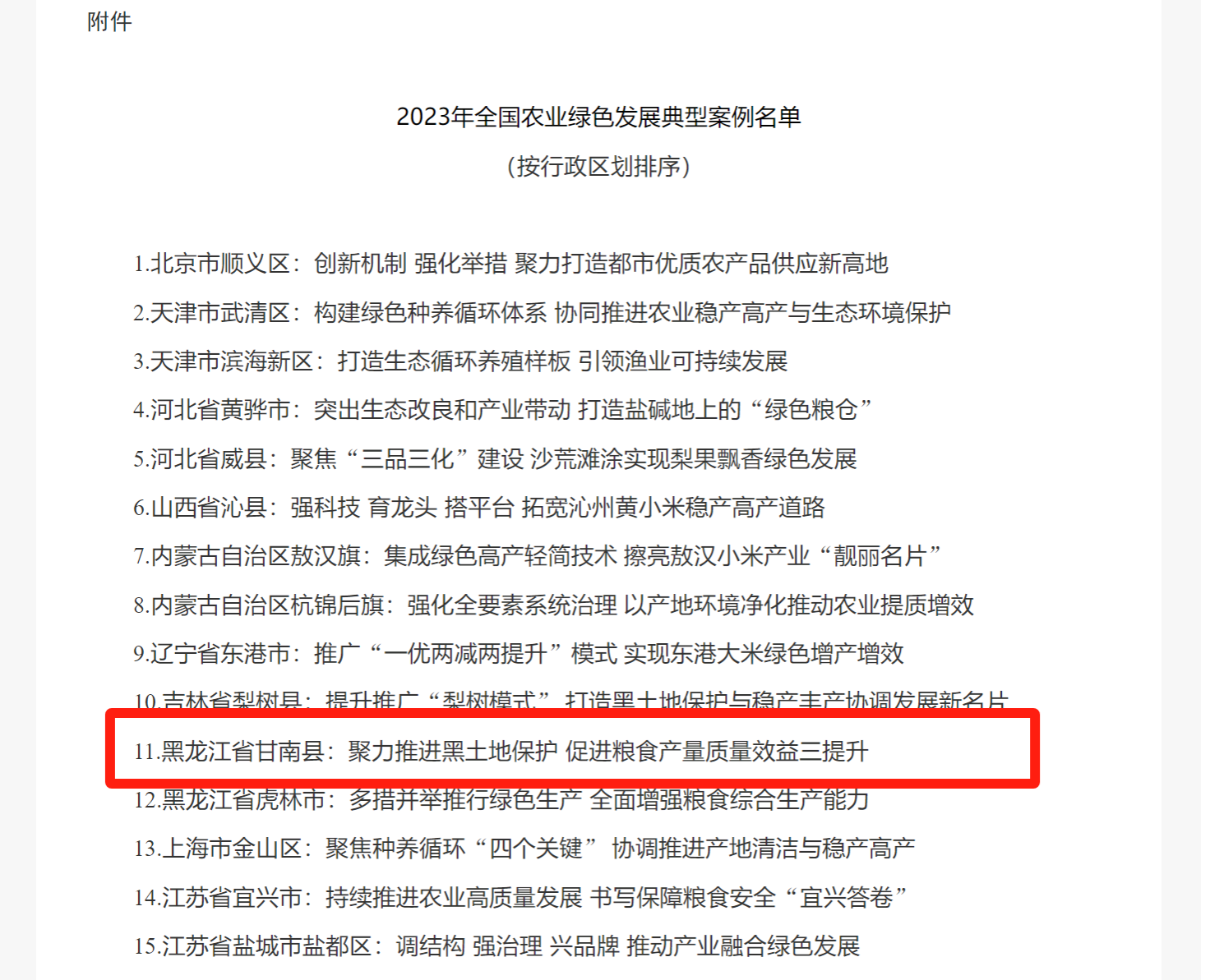 近日,农业农村部网站发布《关于推介2023年全国农业绿色发展典型案例的通知》,对北京市顺义区等47个农业绿色发展典型案例予以发布推介,我校共建单位齐齐哈尔市甘南县以“聚力推进黑土地保护 促进粮食产量质量效益三提升”名列其中。