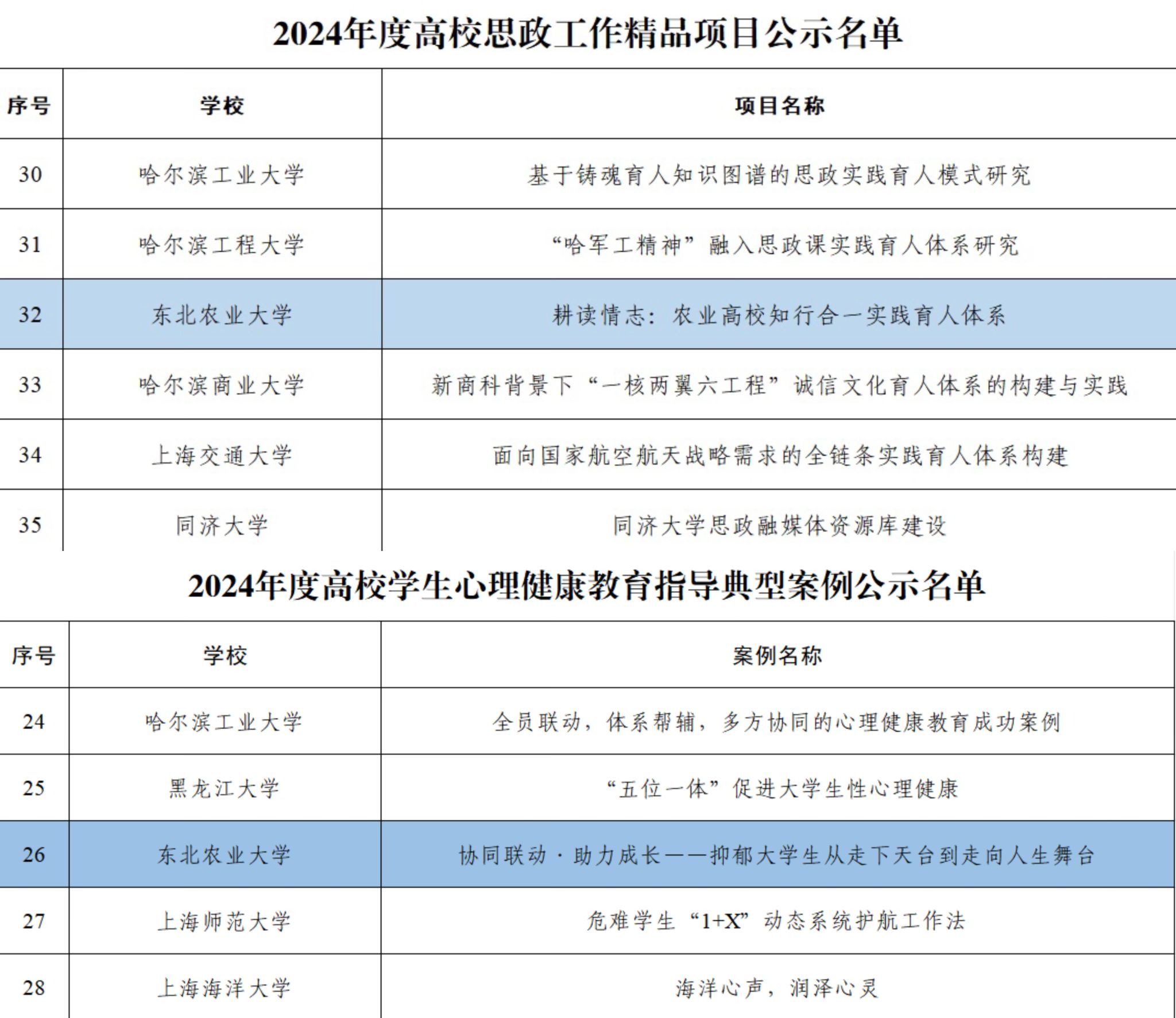 近日,教育部思想政治工作司发布了2024年度高校思想政治工作质量提升综合改革与精品建设项目遴选结果的公示。东北农业大学资源与环境学院党委副书记许辉、学生工作部心理健康中心主任张亮申报的2个项目入选公示名单,入选数量位列全省高校第三名。