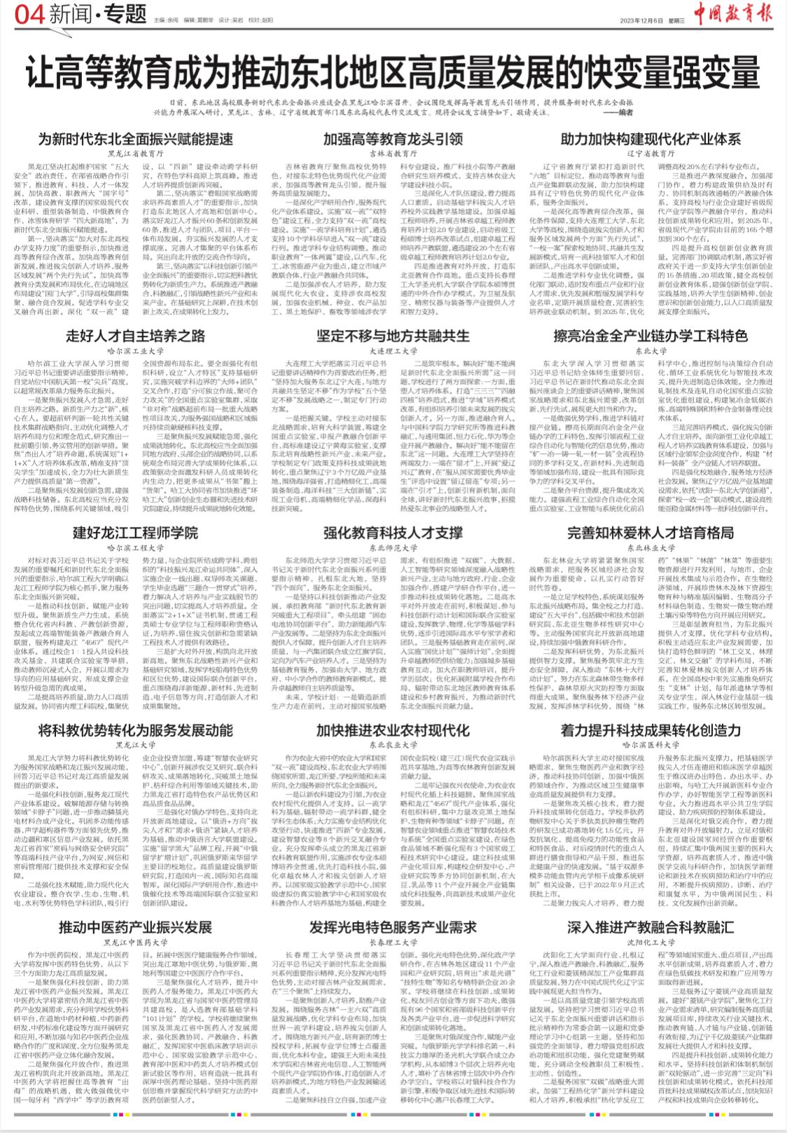 日前,东北地区高校服务新时代东北全面振兴座谈会在黑龙江哈尔滨召开。会议围绕发挥高等教育龙头引领作用,提升服务新时代东北全面振兴能力开展深入研讨,黑龙江、吉林、辽宁省级教育部门及东北高校代表作交流发言。现将会议发言摘登如下,敬请关注。——编者