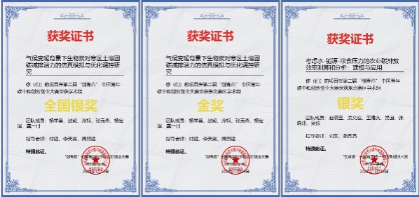 水利与土木工程学院参赛作品《气候变暖背景下生物炭对寒区土壤固碳减排潜力的仿真模拟与优化调控研究》荣获东北赛区金奖、全国银奖,该作品由付强教授、李天霄教授、周照强副教授指导,研究生杨学晨、敖毅、冷旭、张元奇、杨宏泽、龚一丹组成参赛团队,参赛作品《考虑水-能源-粮食压力的农业碳排放效率测算和分析:建模与应用》荣获东北赛区银奖,该作品由刘东教授、张亮亮博士指导,研究生赵倩玉、汝文超、王椿庆、吴迪、张晓建、吴仪组成参赛团队。