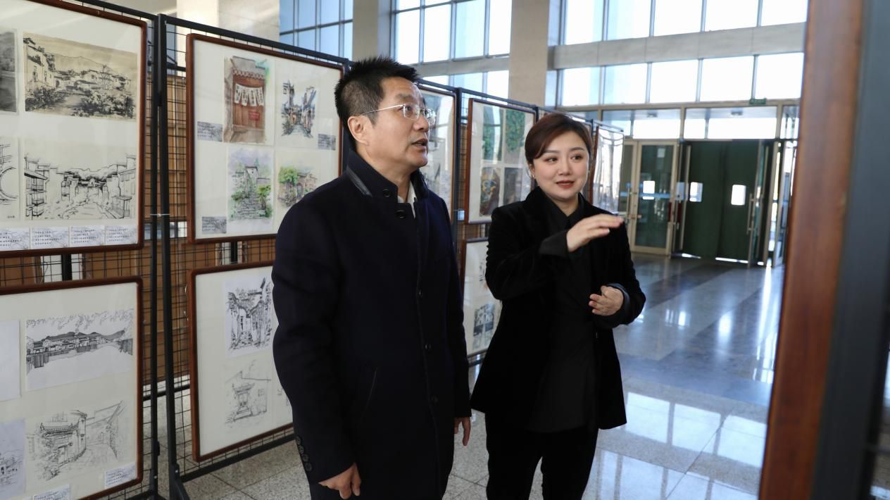 3月25日,我校艺术学院主办的博雅美育第57期“笔下徽州”绘画展在艺术学院一楼大厅开展,学校党委副书记贺景平,宣传部部长吴春丽,艺术学院党委书记于向国、院长刘丹及学院班子成员等观看绘画展。