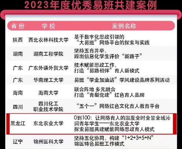 近日,教育部易班发展中心发布了2023年度全国易班共建优秀名单,东北农业大学获得“2023年度优秀易班共建高校”;《0到100:让网络育人的温度全时全景全域沁润青年学生——东北农业大学探索易班共建赋能网络思政育人模式》获评“2023年度优秀易班共建案例”;国际文化教育学院学生贾程玉获评“2023年度优秀易班工作站站长”等3项集体与个人荣誉。