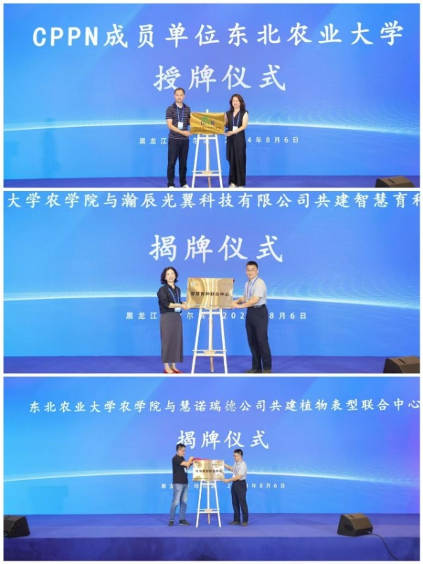 会上启动了东北农业大学农学院与瀚辰光翼科技有限公司共建智慧育种联合中心揭牌仪式。同时,也启动了东北农业大学农学院与慧诺瑞德公司共建植物表型联合中心揭牌仪式。