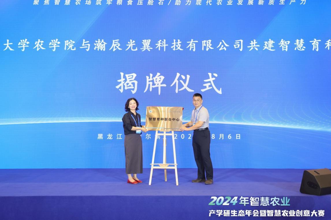 会上启动了东北农业大学农学院与瀚辰光翼科技有限公司共建智慧育种联合中心、东北农业大学农学院与慧诺瑞德公司共建植物表型联合中心揭牌仪式。