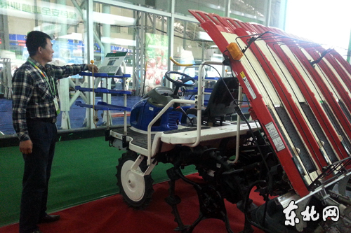 东农展示的国内最新技术插秧机。东北网记者 王蕊 摄