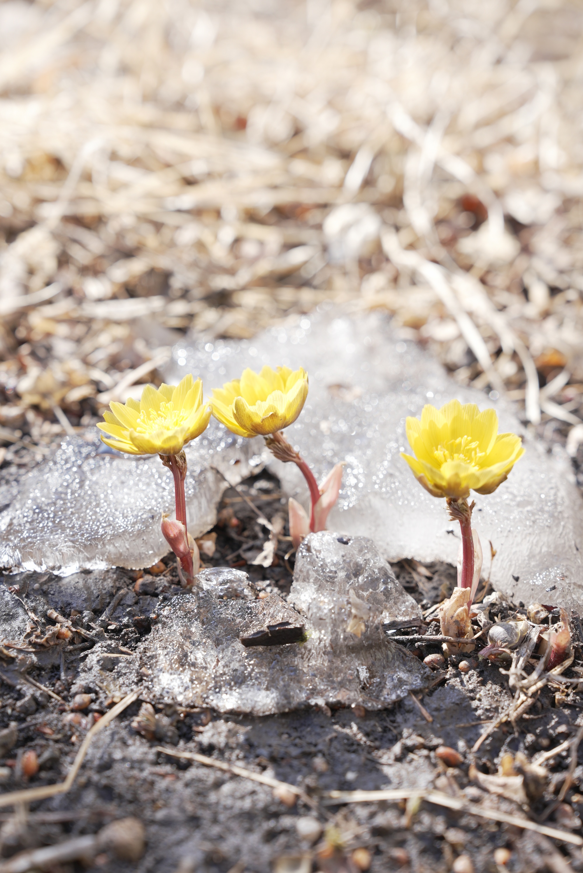 冰凌花学名“侧金盏花”,其耐寒特性使其能在冰雪还未完全消融之际就破土绽放。金黄的花朵顶着晶莹薄冰傲然盛放,形成“冰中花、花上雪”的奇观。