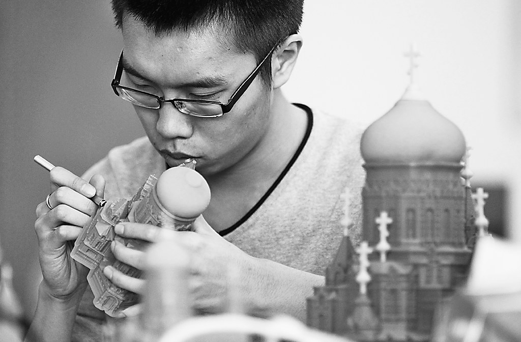 图为杨磊正在对3D打印作品精心修饰。 图片由东北林业大学提供