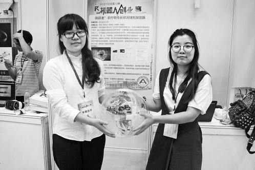 图为全国机器人创业大赛上,东北农业大学参赛项目“‘跳跃者’农作物生长状况球形探测器”,它以球形机构作为载体,集成了多种环境传感器,能够实时监测农作物生长的光、温、水、气等各项参数。