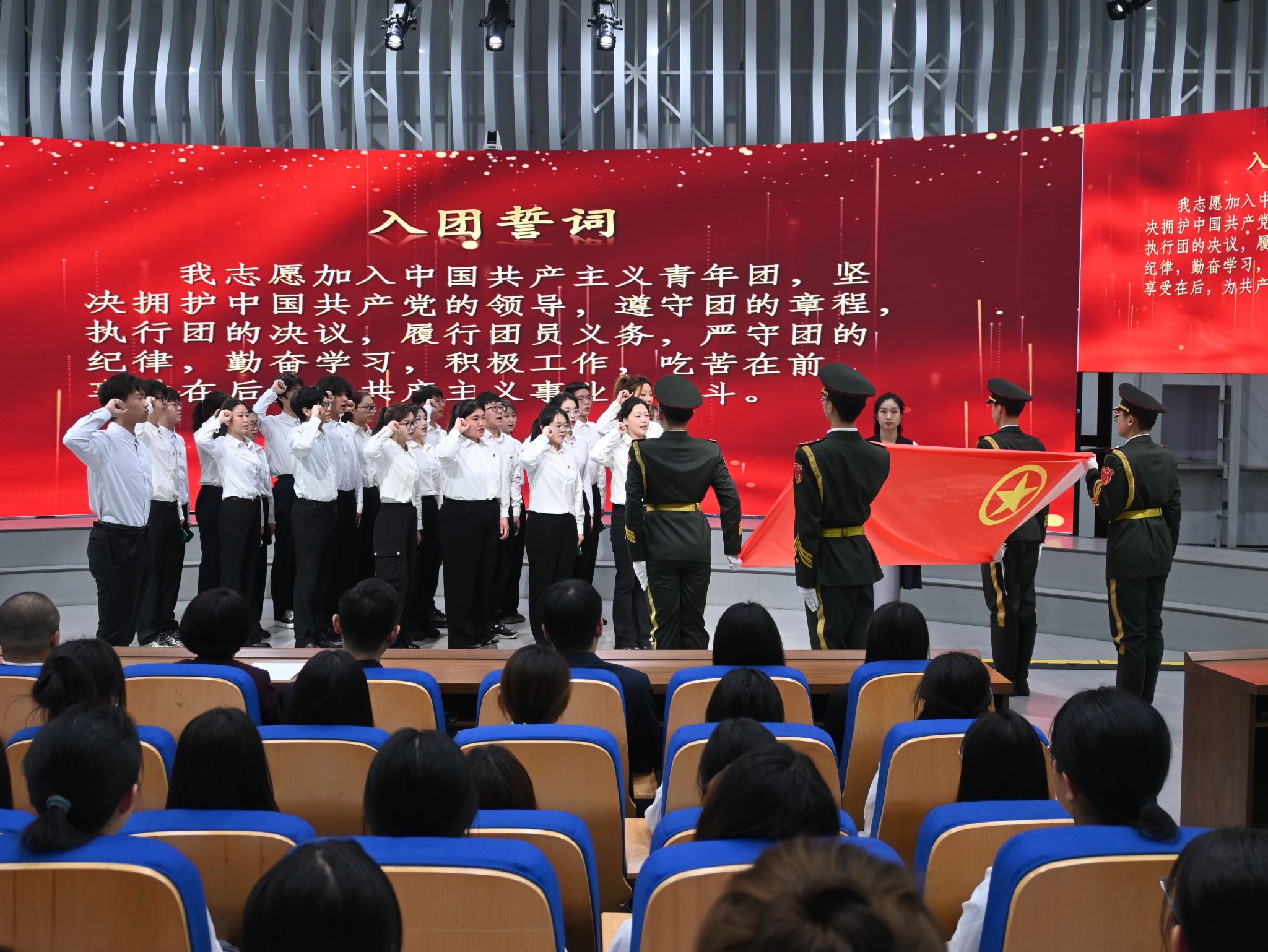 《义勇军进行曲》在会场奏响。在全体师生的共同见证下,庄严的入团仪式正式开始。学院副处级辅导员李伟光宣读新团员名单,辅导员代表为新团员佩戴团徽。