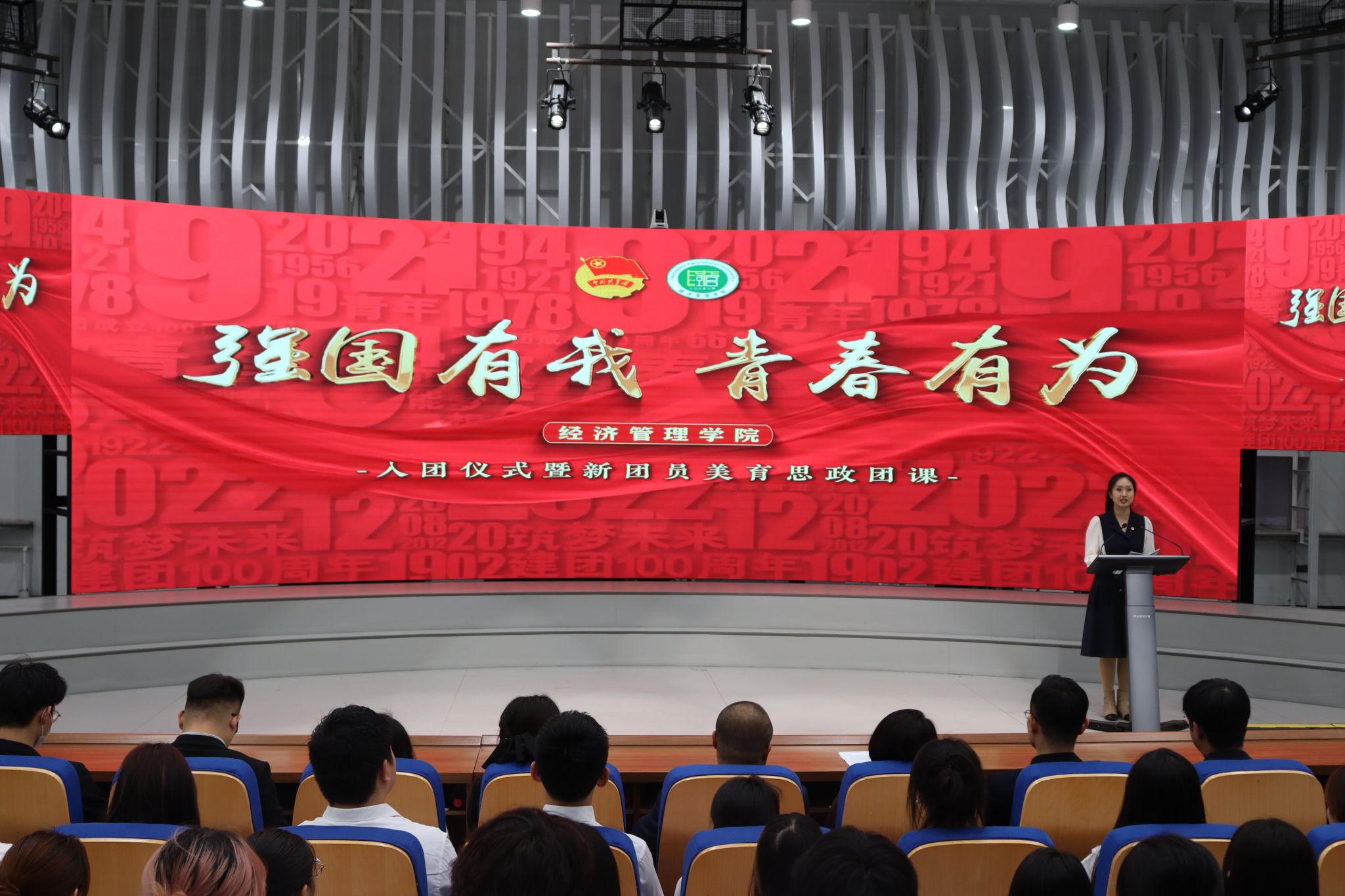 全体师生共唱《光荣啊,中国共青团》。经济管理学院“强国有我,青春有为”入团仪式暨美育思政团课在中国共产主义青年团团歌中落下帷幕。