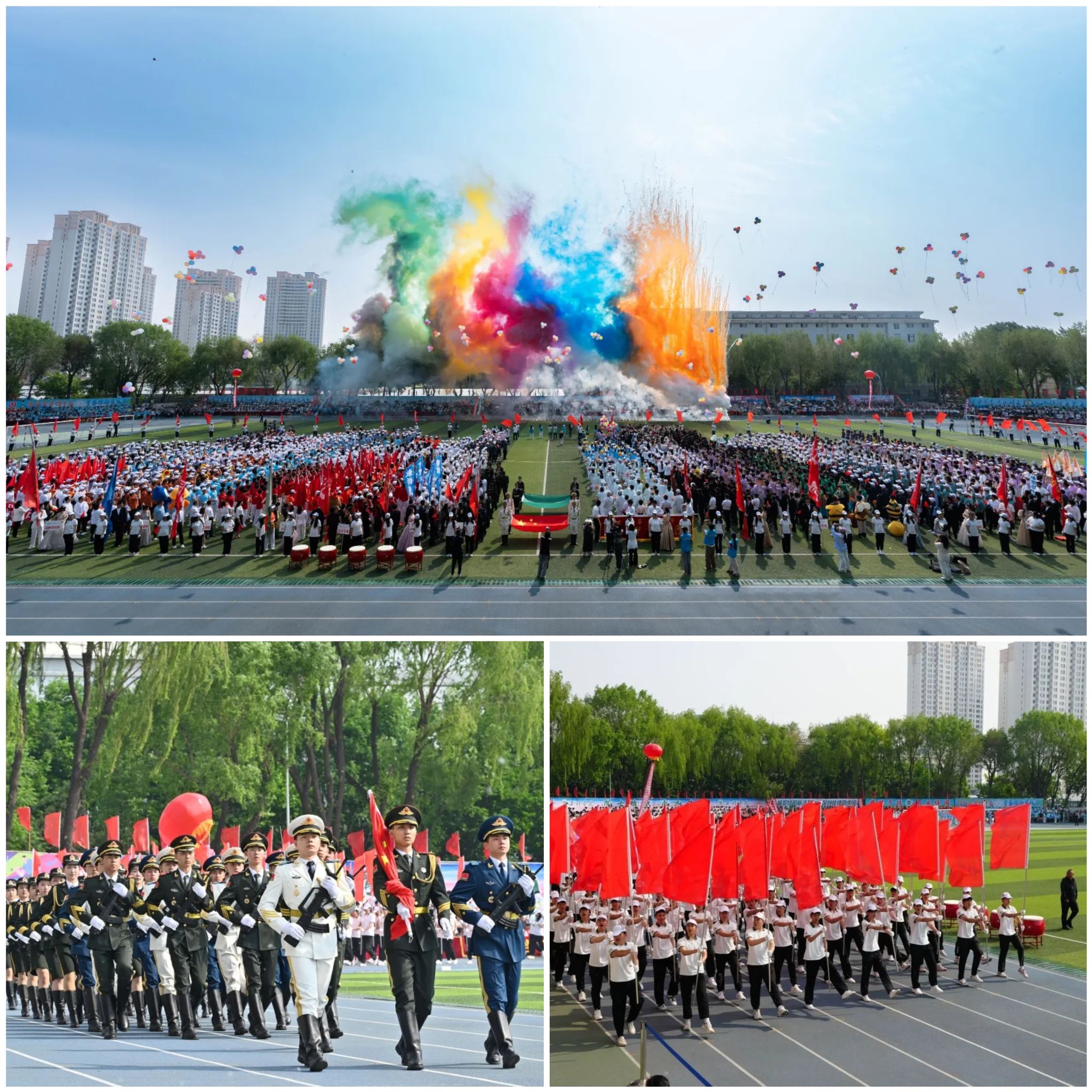 当《义勇军进行曲》奏响,五星红旗冉冉升起,全体师生庄严肃立行注目礼。随着校领导按下开幕启动按钮,五色彩烟腾空而起,象征“为国争光、无私奉献”等中华体育精神的色彩在东农上空绽放。这一仪式不仅拉开赛事序幕,更将“更快、更高、更强、更团结”的奥林匹克精神融入校园文化血脉。