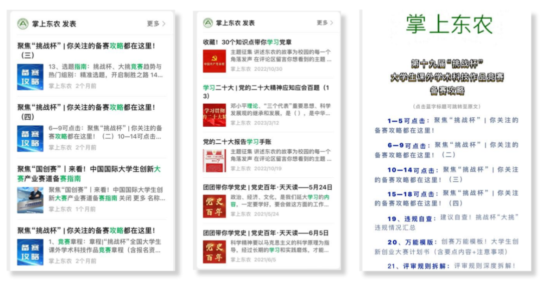 “指尖思政”:打造青年爱看的“网红”教育平台。在数字田野上播种思想,公众号着力构建“指尖上的耕读思政”平台,将“屏幕方寸”转化为“新农人”成长的沃土。立足农业院校特色,平台深度把握当代大学生“碎片化学习+社交化互动”的行为特征,打造了一系列农味十足的思政“网红产品”。推出“青聆党音”“党史天天学”等系列栏目,通过解读“三农”政策、分析党的二十大报告中关于乡村振兴要点等系列推送,将党的二十大精神转化为年轻人追捧的“知识爆款”,评论区涌现近千条学习感悟。这些“农”味十足的“爆款”知识获得超预期反响,“把思政课搬到田间地头,让党的创新理论在数字土壤生根”,这正是公众号的独特育人智慧。在这里,每一粒“知识种子”都带着泥土的芬芳,每一次滑动屏幕都是思想的耕耘,培育着新时代的“数字新农人”。