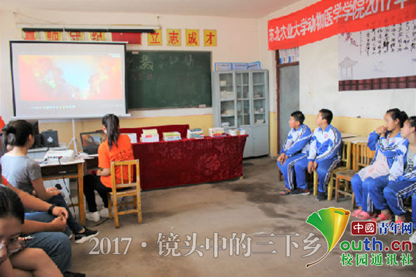 图为实践队员为留守儿童播放宣传片。中国青年网通讯员 夏婷婷 摄