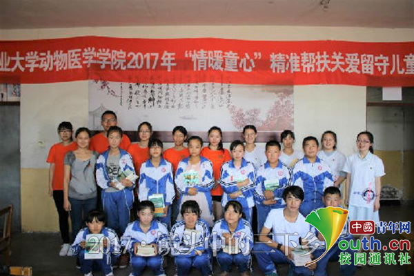 图为刘钊熠老师、实践队员与留守儿童合影留念。中国青年网通讯员 孙静萍 摄