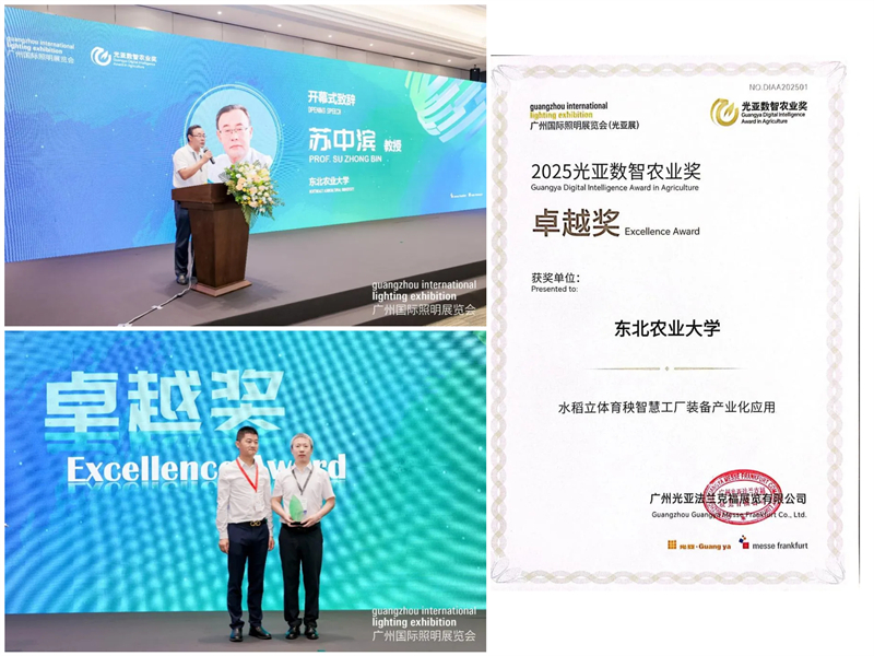 近日,在广州国际照明展览会(GILE2025)生物光学与智慧农业专区展上,东北农业大学电气与信息学院苏中滨教授团队凭借“水稻立体育秧智慧工厂”前沿成果,一举摘得首届光亚数智农业奖卓越奖,以科技创新实力赢得行业高度赞誉。