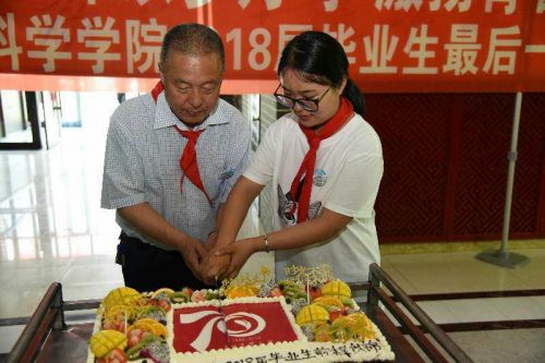 东北农业大学党委书记孙登林与毕业生共切建校70周年华诞生日蛋糕。
