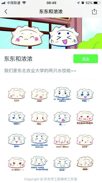 记者看到,只要在微信表情搜索栏里搜索“东东与浓浓”,就能免费下载这套表情包。这套情包共有16种不同形象,它们有的可爱、有的微笑、有的撒娇、有的卖萌。据学工处老师李晓宇介绍,饺子表情包形象都是由学校的学生设计的,“从设计到表情包上线,一共用了一个半月时间。表情包上线后,师生都很喜欢用,特别是毕业生,都觉得很惊喜。”