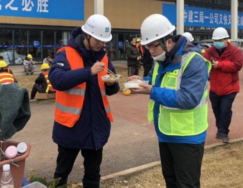 为了更快建好雷神山医院,汪念慈(右)和同事只能在室外匆匆吃午饭。