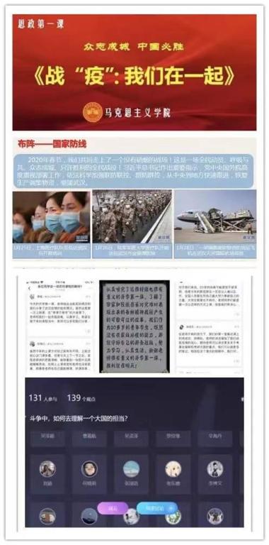 黑龙江科技大学思政第一课在“云端”开讲,“平台上课、学习群跟进、智能学习考试系统教学效果考评”三位一体线上教学反响良好。抽调“形势与政策”教研室骨干教师编制“众志成城,共克时艰”专题教学课件,设置抗击疫情系列教学专题,精心打造每一节思政课。通过见面课中“课堂答疑”“头脑风暴”等环节,引导广大学生正确认识防疫抗疫形势和党中央战疫到底的决心,更好地感受在防疫抗疫过程中体现出来的中国力量、中国精神以及中国的大国担当,增强学生打赢抗击疫情信心,为大学生上好爱国主义教育大课。