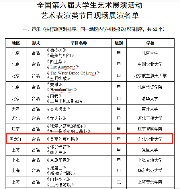 近日,教育部公布了全国第六届大学生艺术展演活动现场展演名单,由东北农业大学大学生艺术团合唱团报送的合唱作品《美丽的夏牧场》在全国千余个艺术表演类节目中脱颖而出,成功入围,并将作为黑龙江声乐类唯一一所入围高校代表黑龙江省参加5月6日至13日的全国现场展演活动。