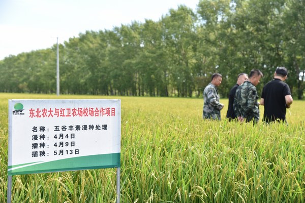 在农垦系统,东北农业大学与建三江管理局全面合作。朱志猛介绍,“3年来,双方合作农场从1个扩展到11个,合作项目从7项增加到12项,推广面积从几百亩扩大到上万亩。”其中,东北农业大学生命科学学院教授向文胜研发的“五谷丰素生物制剂技术”增产增收效果显著。“五谷丰素”是生物制剂,无需增加任何劳动环节,可以促进水稻多个时期的生长,平均可增产10%左右。东北农业大学资源与环境学院教授彭显龙研发的“寒地稻田简化高效施肥技术”可以按照土壤养分状况和水稻需肥规律,确定水稻需肥总量,并生产适合稻田机械施用的高效肥料。
