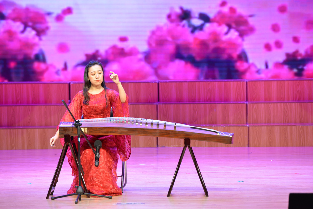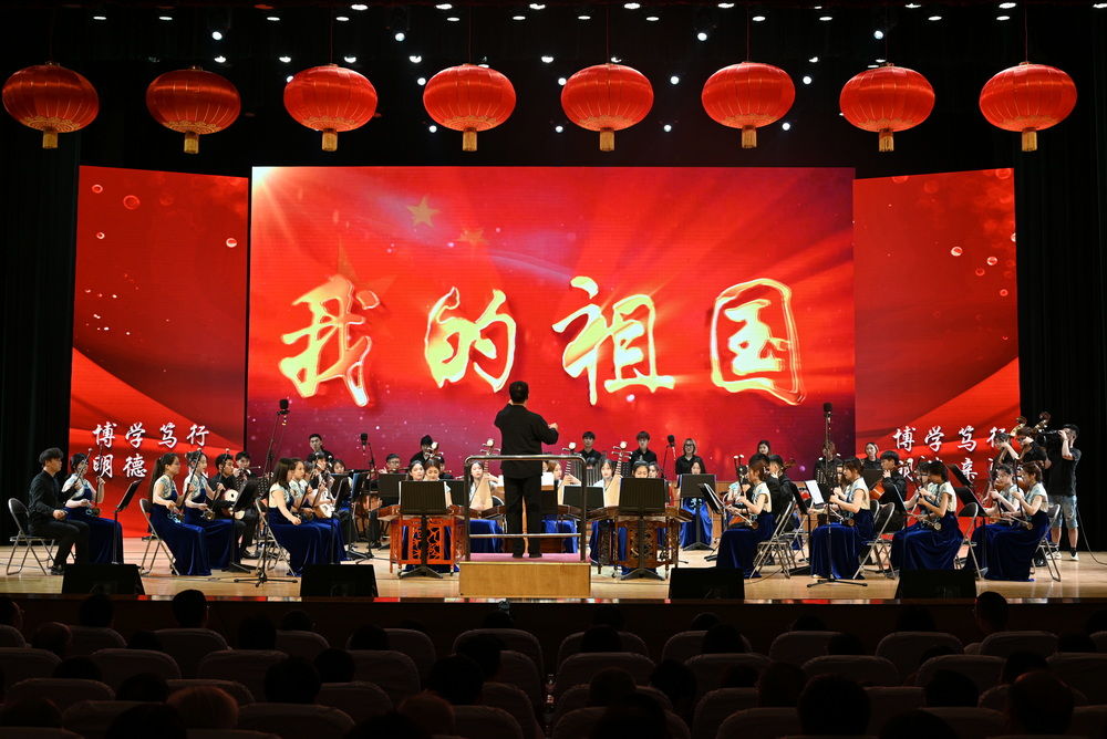 音乐厅内华灯璀璨、流光溢彩,“永远跟党走”主题标识热烈醒目,到处洋溢着喜庆浓厚的节日氛围。18时30分,在学校大学生舞蹈团表演的歌舞《你是灯塔》的红色氛围里,演出正式拉开帷幕。学子们用慷慨激昂的诗朗诵《永远跟党走》带领全场观众回望历史,讴歌了在觉醒年代,胸怀爱国主义和革命精神的知识青年用青春和热血铺就的追求真理、追求进步之路。校青年民族管弦乐团演奏了民乐合奏《我的祖国》,演奏饱含激情,表达了真挚的爱国主义情怀。