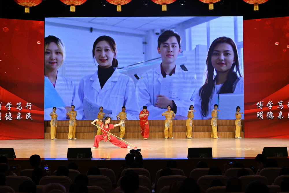 整场演出高潮迭起,精彩节目一个接着一个,热烈的掌声一段接续一段。古筝独奏的红色曲目《山丹丹开花红艳艳》悠扬婉转,令人耳目一新。明快的节奏、矫健的身姿,校大学生健美操队表演的健美操《青春旋律》充满动感活力,青春气息扑面而来。学生歌曲联唱《我们都是追梦人》融入了大量东农校园生活画面,情景演绎与表演交融,生动展示了东农学子丰富精彩、健康向上的校园文化生活。